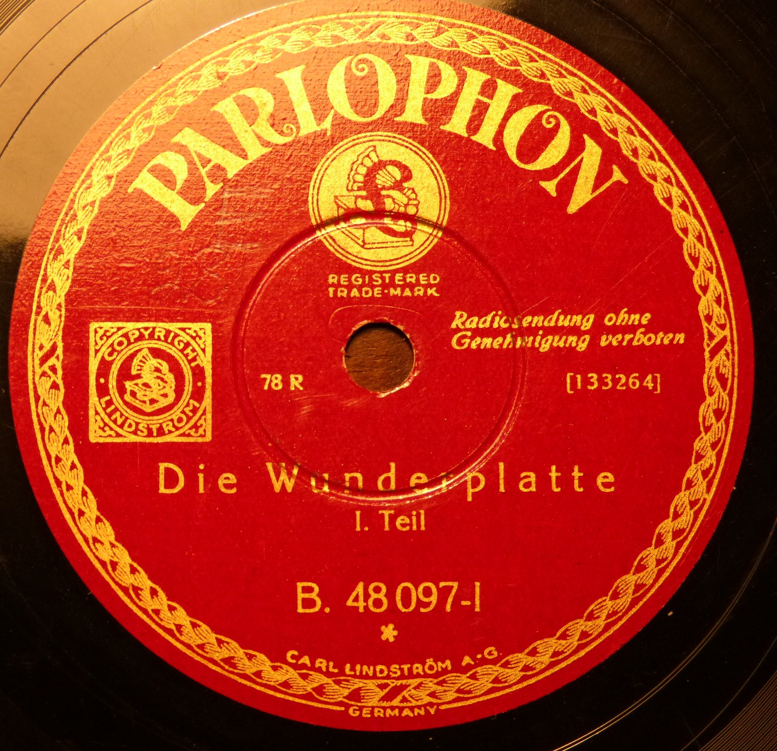 Auf Parlophon hieß so etwas "Die Wunderplatte" und kam in zwei Teilen. Parlophon B. 48097-I (mx. 133.264) enthielt a) Helenen-Marsch (Friedrich Lübbert), b) Großmütterchen, Salon-Ländler (Gustav Langer), c) Üb immer Treu und Redlichkeit, Lied, und -II (mx. 133.265), enthielt a) Hab ich nur Deine Liebe, Lied, b) Venite pur avanti (Mozart) und c) La Paloma, Lied (Yradier), gespielt von einem Orchester unter Leitung von Otto Dobrindt.