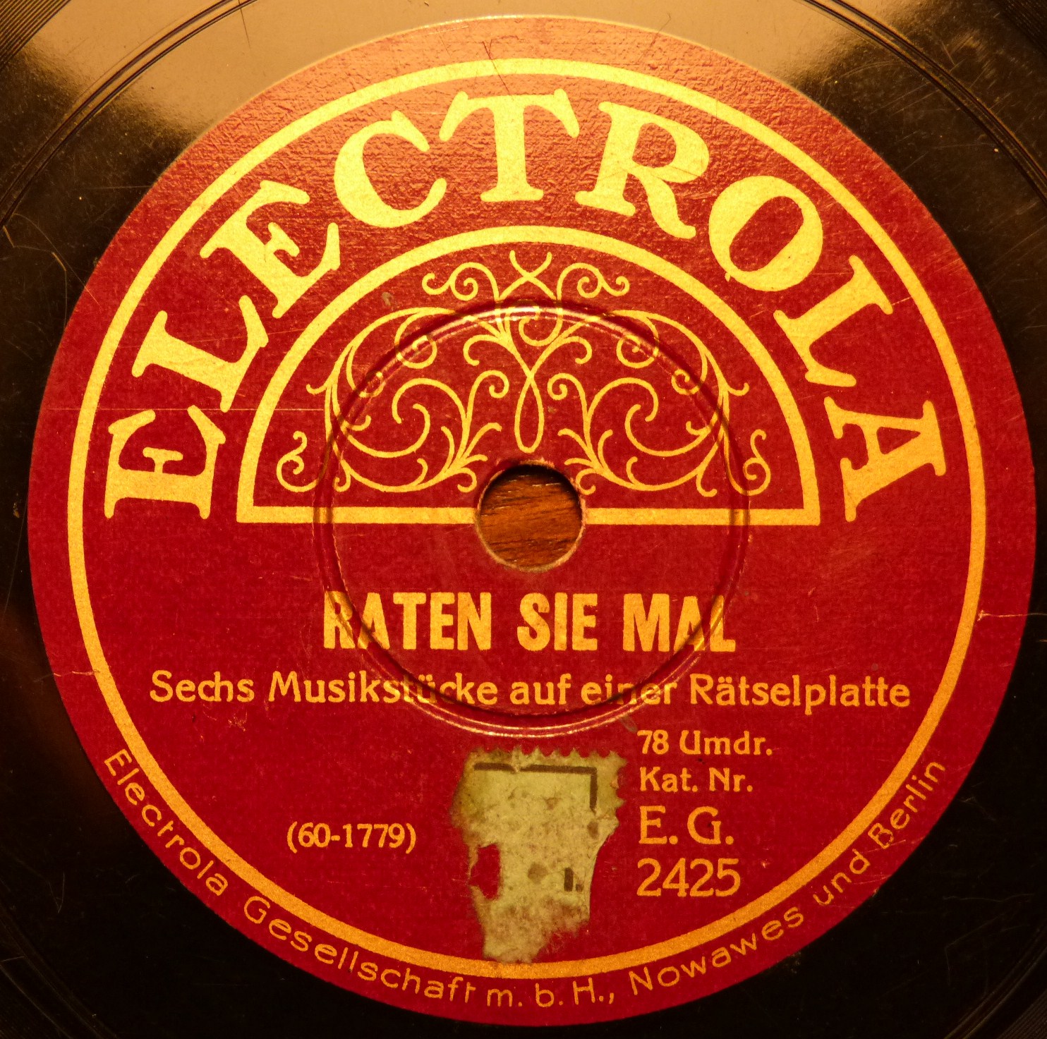 Mehrrillenplatten gab es auch bei der Konkurrenz auf Electrola. Sie standen unter dem Motto "Raten Sie mal" und enthielten "sechs Musikstücke auf einer Rätselplatte", so z. B. auf E.G. 2425 / 60-1779. Hier blieben die Musiker ungenannt.